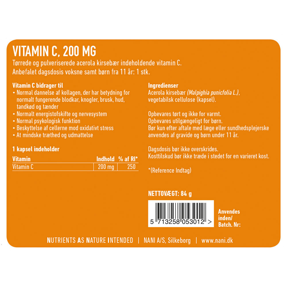 Vores Acerola C er et ideelt produkt til dig, der vil støtte dit immunsystem og dig, der gerne vil støtte kroppens egen dannelse af kollagen, som bl.a. har betydning normalt fungerende blodkar, brusk, knogler, tænder, hud og tandkød. Derudover bidrager C vitamin til at mindske træthed og udmattelse, det støtter et normalt energistofskifte og nervesystem, det bidrager til en normal psykologisk funktion og er med til at beskytte cellerne mod oxidativ stress.
