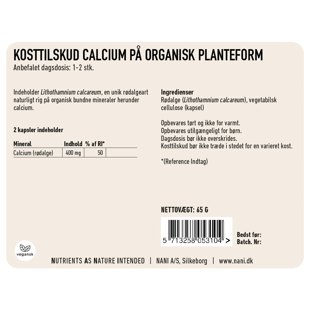 Vores Calcium på organisk planteform består udelukkende af en unik rødalgeart, nemlig Lithothamnium calcareum, fra Island. Algen udmærker sig ved at være særlig dygtig til at optage mineraler fra sine omgivelser, herunder i særdeleshed calcium, men også magnesium, jod og alle spormineralerne. Algen er blot renset, tørret og pulveriseret hvorefter den er kommet i en vegetabilsk kapsel. Du får derfor et helt vegetabilsk og organisk tilskud af calcium fra en 100% naturlig kilde.
