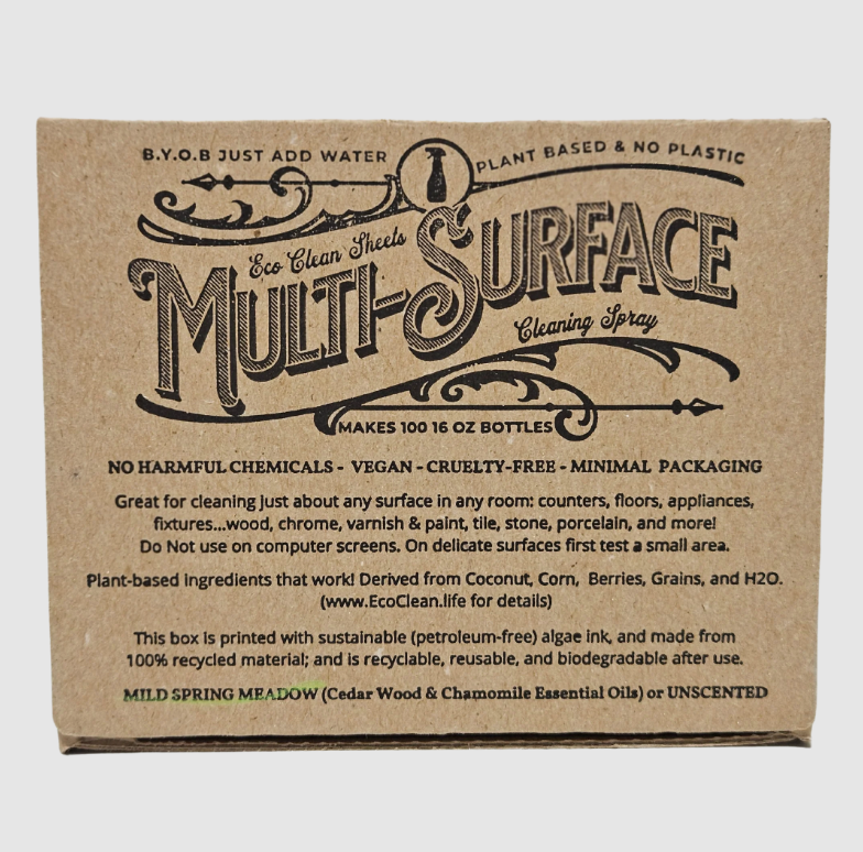 Konsentrerað, zero waste og natúrligt reingeringarevni í ørkum. Tak eitt ark, skræð í helvt, koyr í eina sprayfløsku og fyll við vatni. Arkið upploysist í vatninum og so er klárt at vaska nærum allar flatur - eisini í køkinum og baðrúminum!